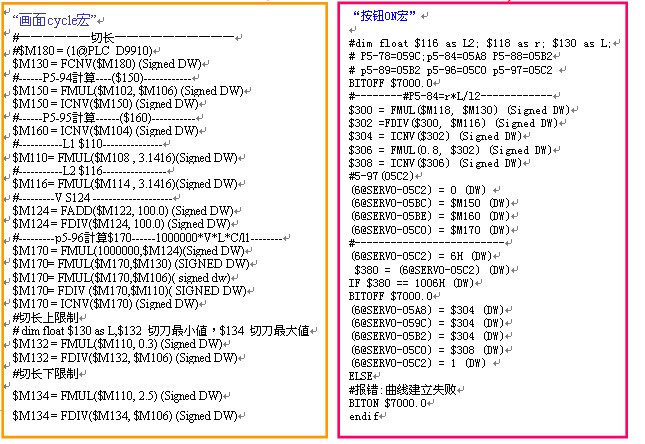 ASD-A2伺服控制器飞剪曲线的建立,除了利用PC软体所提供的ECAM EDITER建立外,还提供更加便捷的曲线建立方式,即HMI飞剪曲线建立功能。其HMI规划如图,用户只需在装机时将设备机械结构参数输入HMI,通过HMI宏指令便可控制伺服控制器实现飞剪曲线的建立,如需生产规格变更,用户只需输入裁切长度,飞剪曲线便可自动变更。